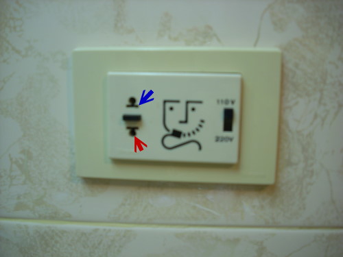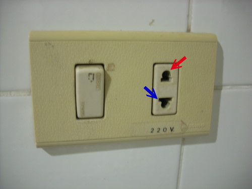 清邁旅館的插座:藍色箭頭處適合台灣扁長型的插頭,如果是數位相機的充電器